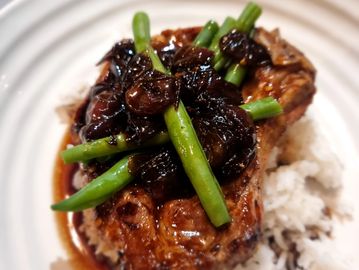A juicy pork cutlet with an explosive mouth watering sweet and sour balsamic sauce accompanied by slow cooked white rice and green vegetables.
