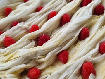 Crispy filo pastry with a cypriot style coconut custard cream and raspberries bake.