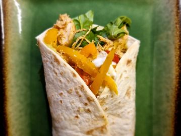 Chicken fajitas, tortilla wraps, homemade guacamole, sour cream with chives, tomato