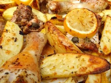 Chicken marinated with baby artichokes, capers, various Greek herbs such as oregano and lemon zest accompanied by wedged potatoes and salad. Choose between Chicken thighs or drumsticks or both (two pieces per portion)