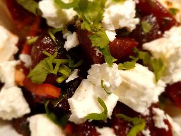 We slow cook our beetroot for couple of hours and mix with spring onions, feta cheese and a splash of greek virgin olive oil.