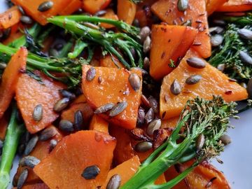 Butternut squash with roasted sunflower seeds and broccoli.