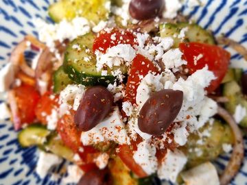 One of the most popular Greek dishes across the world - Greek Salad. a combination of cucumbers, vine tomatoes, red onions, authentic feta cheese and black greek olives. A dish that speaks for itself.
