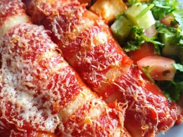 Crepes filled with bechamel based bolognese sauce and finished with tomato sauce and grated halloumi cheese, accompanied with a refreshing salad.