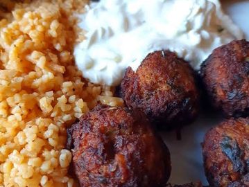Keftedes are Cypriot meatballs made with a mixture of pork mince meat, grated potatoes, parsley, onions, eggs and greek herbs, accompanied with bulgur wheat and a refreshing salad.