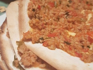 An ancient dish originating from the Middle east and very popular in Turkey. Lahmacun its a spicy lamb mince meat cooked on top of a homemade flatbread. Can be eaten as a snack, lunch or at dinner.