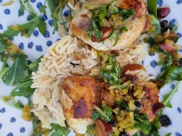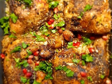 Crispy chicken cooked with middle Eastern spices and served with delicious rice and pomegranate.