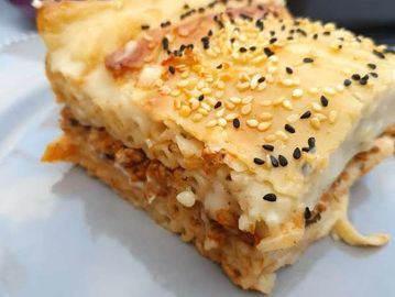 Traditional Greek cheesy bolognese pasta bake finished with a creamy bechamel sauce and grated halloumi cheese. A dish you can eat straight out of the fridge or piping hot out of the oven.
