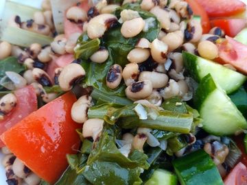 Slow cooked blackeyed beans served with tomatoes and cucumbers dressed in Greek virgin olive oil and lemon. The perfect vegan dish - great for heart health as they are high in fibre, potassium, folate, vitamin B6 and contain no cholesterol.