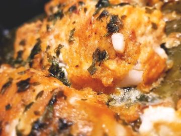 A delicious flaky cod fillet finished with garlic butter and served with rice.