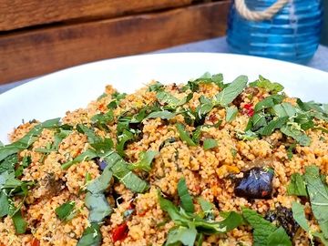Couscous mixed with refreshing mint semi sundried tomatoes and greek olives.