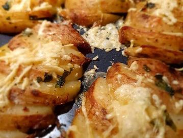 Roasted potatoes sliced and drizzled in garlic butter before sprinkled with melting cheese.